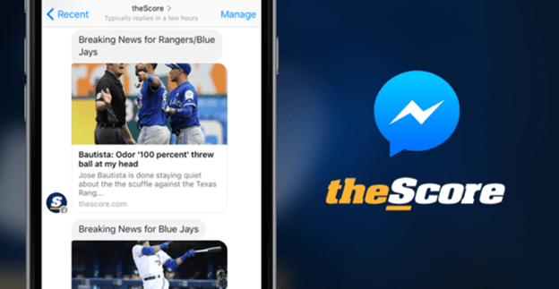Segue um exemplo de como o Score usa um chatbot para fornecer aos fãs atualizações sobre seus times favoritos.