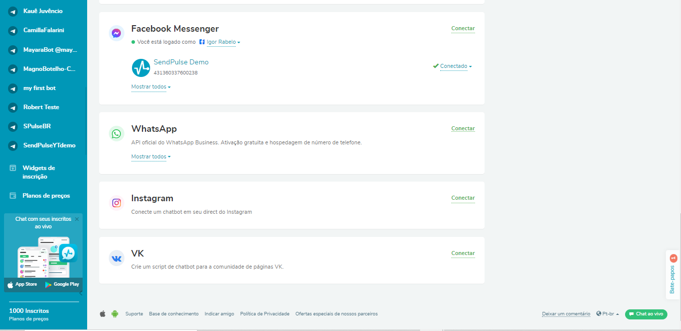 Os usuários da SendPulse podem testar o bot se inscrevendo nele antes de lançá-lo para clientes reais.