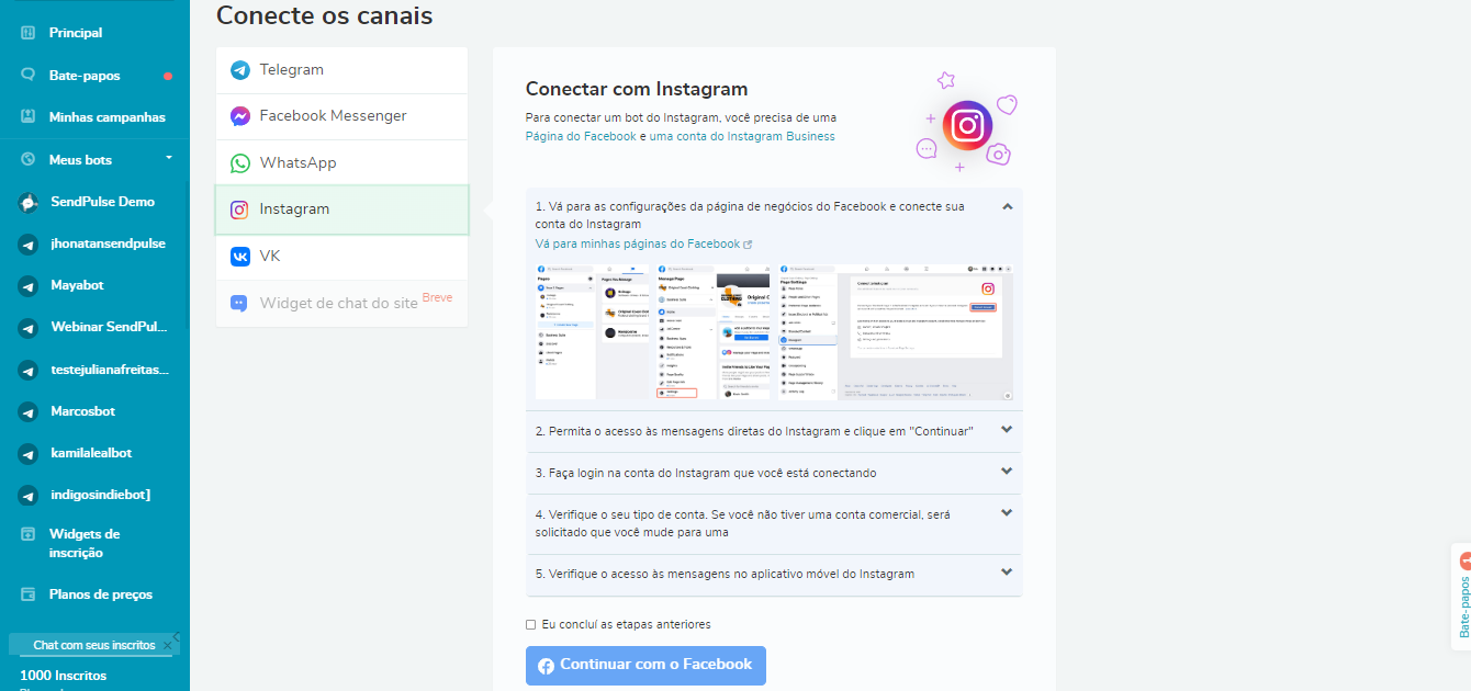 Para conectar um bot ao Instagram, você precisa ter uma página no Facebook e uma conta comercial no Instagram. Siga as instruções na captura de tela para conectar sua conta a uma página comercial do Facebook.