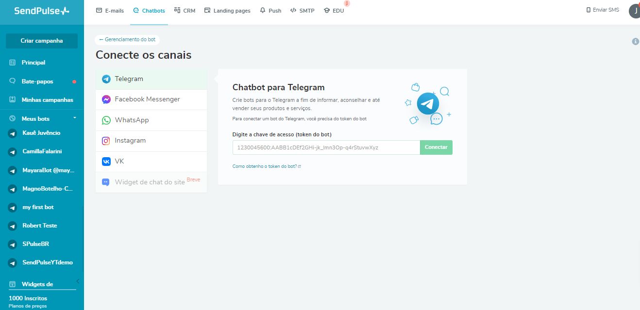 Navegue até a guia "Chatbots" e clique no botão "Conectar".