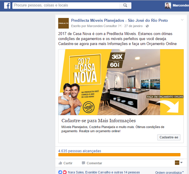 Abaixo você pode ver um exemplo de um anúncio do Facebook segmentado por localização. Predilecta Móveis promove sua campanha de orçamento gratuita e permite que os usuários façam o pedido diretamente da publicidade.