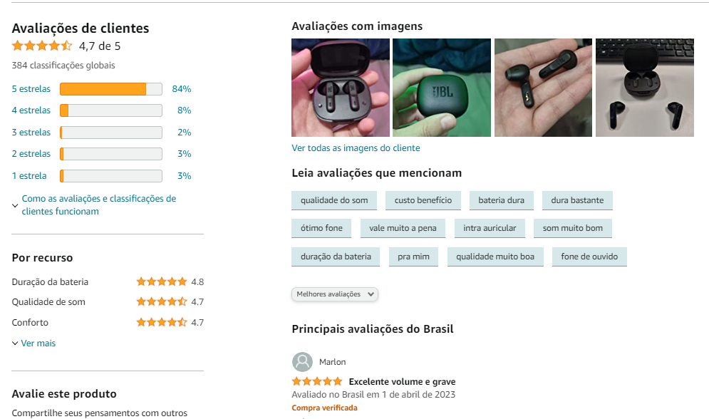 A Amazon implementa o tipo mais eficaz de prova social: avaliações de clientes. Com a ajuda deles, novos visitantes podem conhecer a experiência que as pessoas tiveram com um produto específico. Os consumidores em potencial podem ler o feedback do cliente e ver as fotos do produto para descobrir se estão satisfeitos com ele. Além disso, os usuários podem ver as classificações dos produtos com base no número de estrelas que os consumidores dão.