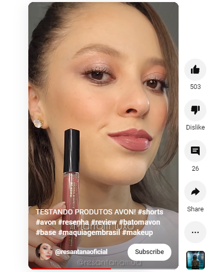 A Avon é uma marca de produtos de beleza extremamente popular. Uma das clientes da marca fez um review por meio dos Shorts do YouTube, marcando a Avon com o uso de hashtags. A influenciadora demonstra como usar os produtos e qual é o resultado obtido, ajudando clientes a descobrir se é o que buscam e o que pensam da qualidade dos produtos.