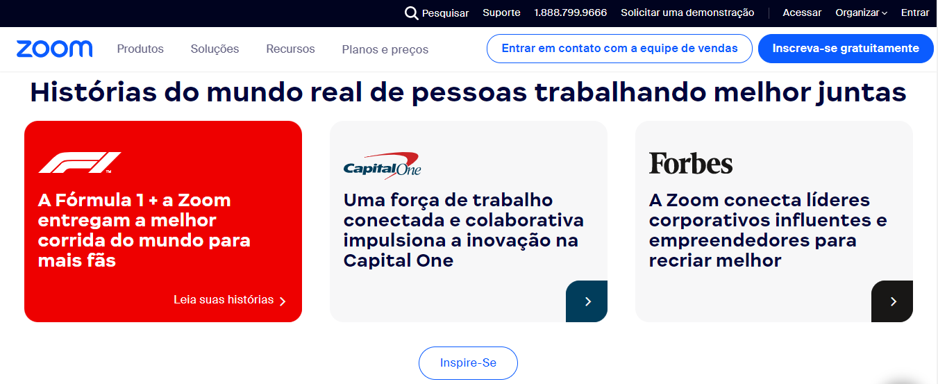 O Zoom usa depoimentos de clientes para atrair clientes em potencial. Assim que os visitantes acessam o site da empresa, eles podem rolar para baixo para ver depoimentos de representantes de marcas famosas que utilizam essa plataforma de comunicação para diversas necessidades. Como resultado, os usuários podem ter uma visão geral do serviço e seus benefícios.
