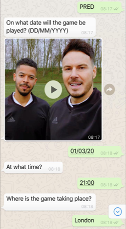 Os times de futebol frequentemente encontravam problemas com determinadas coisas. Alguns jogadores podem largar tudo no último minuto antes de uma partida, e pode não existir um substituto. A Adidas ofereceu encontrar um substituto por meio do WhatsApp. Tudo que você precisava fazer era enviar uma mensagem para uma hotline, ou “linha quente”, do WhatsApp e compartilhar informações essenciais sobre a partida. Em troca, a Adidas te enviaria um jogador de alto nível para seu jogo.