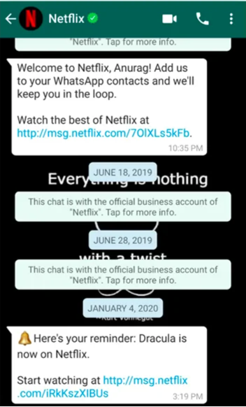 A Netflix lançou sua campanha em Janeiro de 2017, na Índia - o maior mercado de WhatsApp. Usuários que tinham ambos, o Netflix e o Whatsapp, instalados nos seus smartphones, viram a oferta de manter contato por meio do serviço de envio de mensagens, Whatsapp. Se uma pessoa clicava em “Estou dentro”, eles começavam a receber mensagens sobre suas contas e sugestões de programas de TV e sugestões. Depois de um ano, a Netflix ofereceu a mesma oportunidade para usuários no Reino Unido.