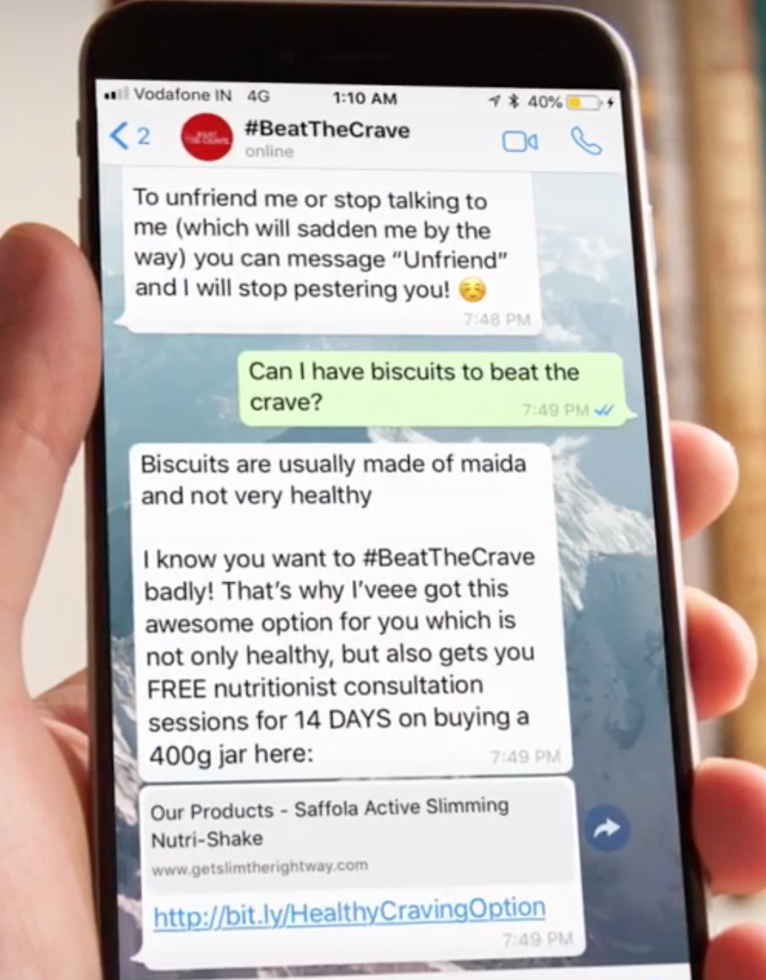 Para ajudar essas pessoas a combaterem seus hábitos de alimentação destrutivos, a Saffola criou um chatbot para o WhatsApp. Um usuário poderia enviar uma mensagem para esse bot quando eles sentiam um ímpeto por “comfort foods”, ou comidas que trazem conforto. Em troca, o chatbot tentava distrair uma pessoa com reforços positivos pré-gravados, quebra-cabeças/enigmas, e até mesmo uma música de rap. Esta última promovia a nova bebida saudável da Saffola.