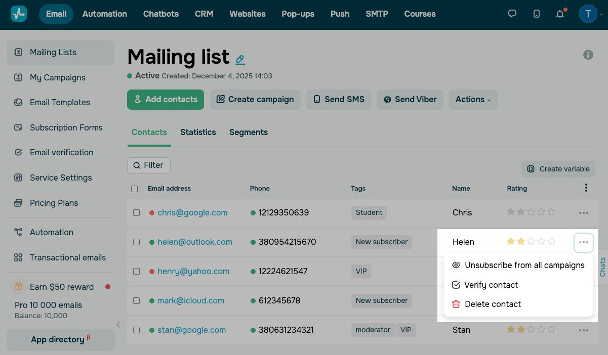 Use contact management tools in a mailing list to control subscribers’ engagement, data, and ability to receive email campaigns.