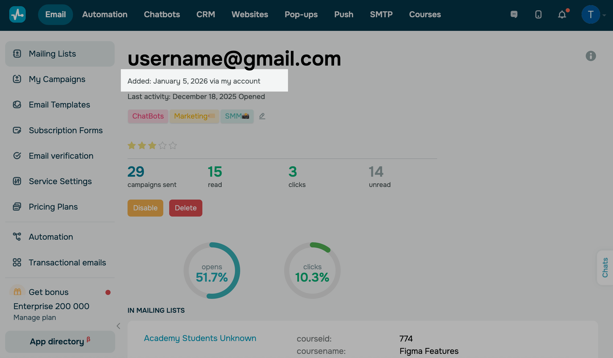 | Disable | Deactivates the contact's subscription to your emails. You will be able to reactivate it later if needed. Their data remains in the system, but they will not receive emails from you. |