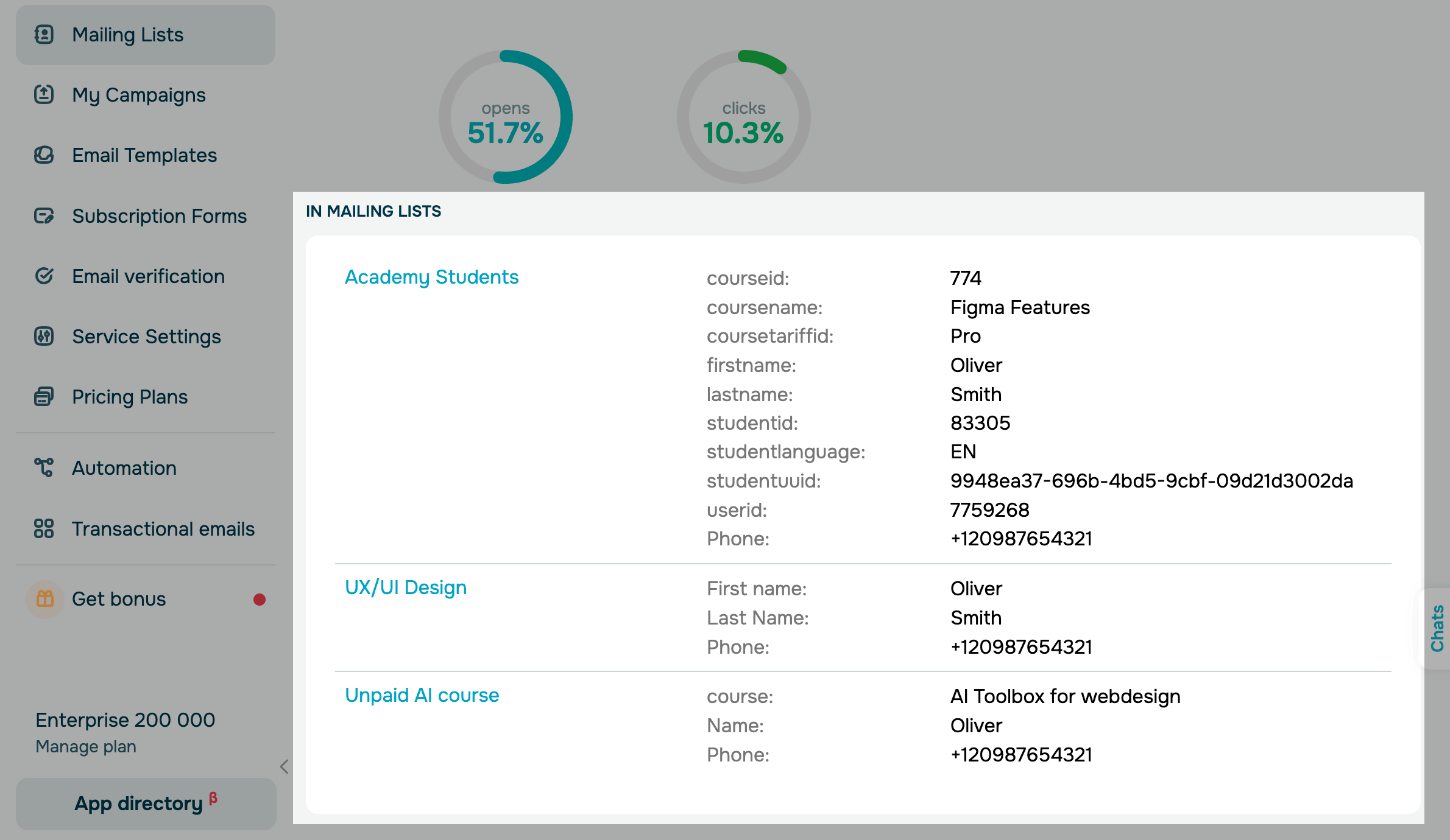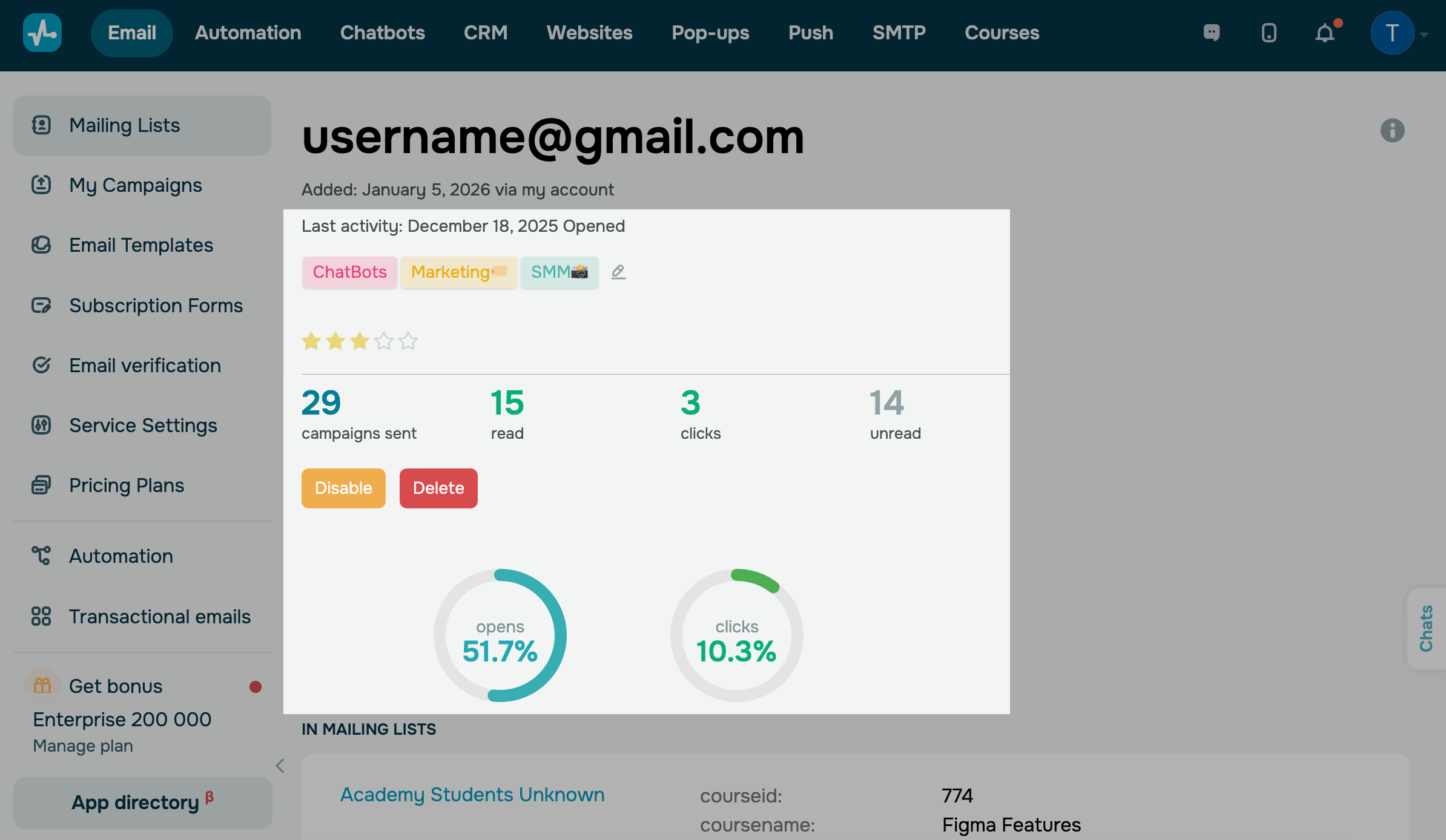 Contact statistics help you understand how subscribers engage with your campaigns and evaluate their interest in your content. Contact cards bring together all key information about their activity.