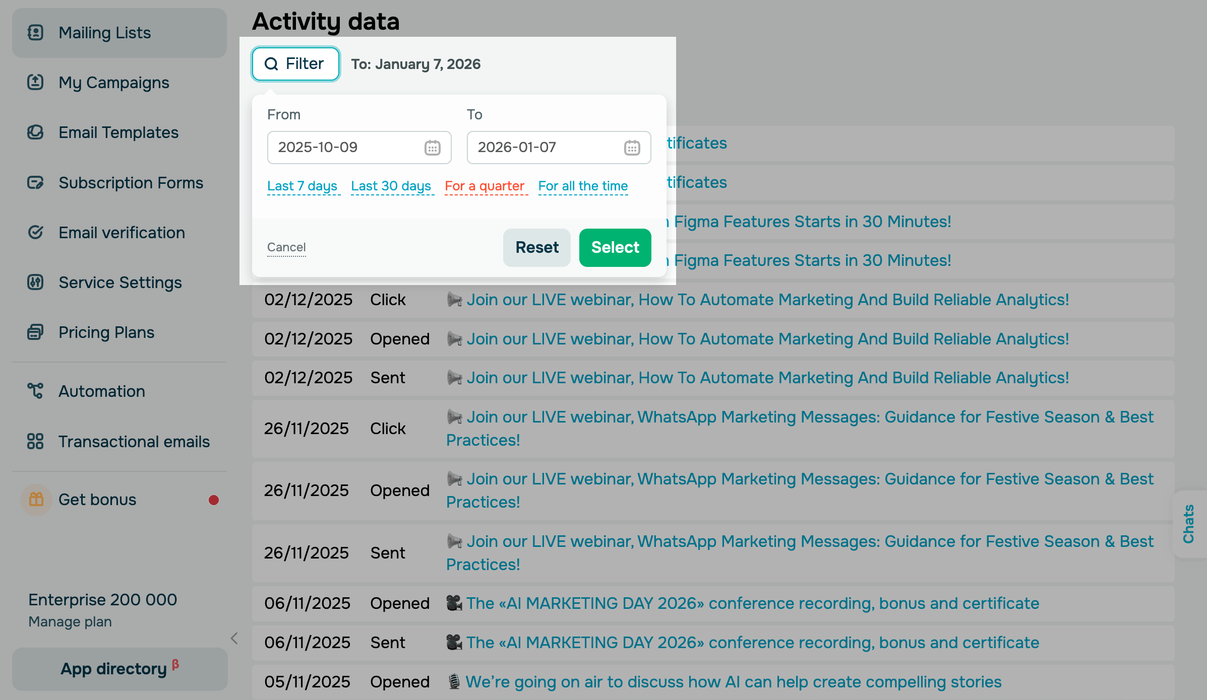In the Activity data section, you can view the list of sent campaigns and the contact’s activity status for each one:
