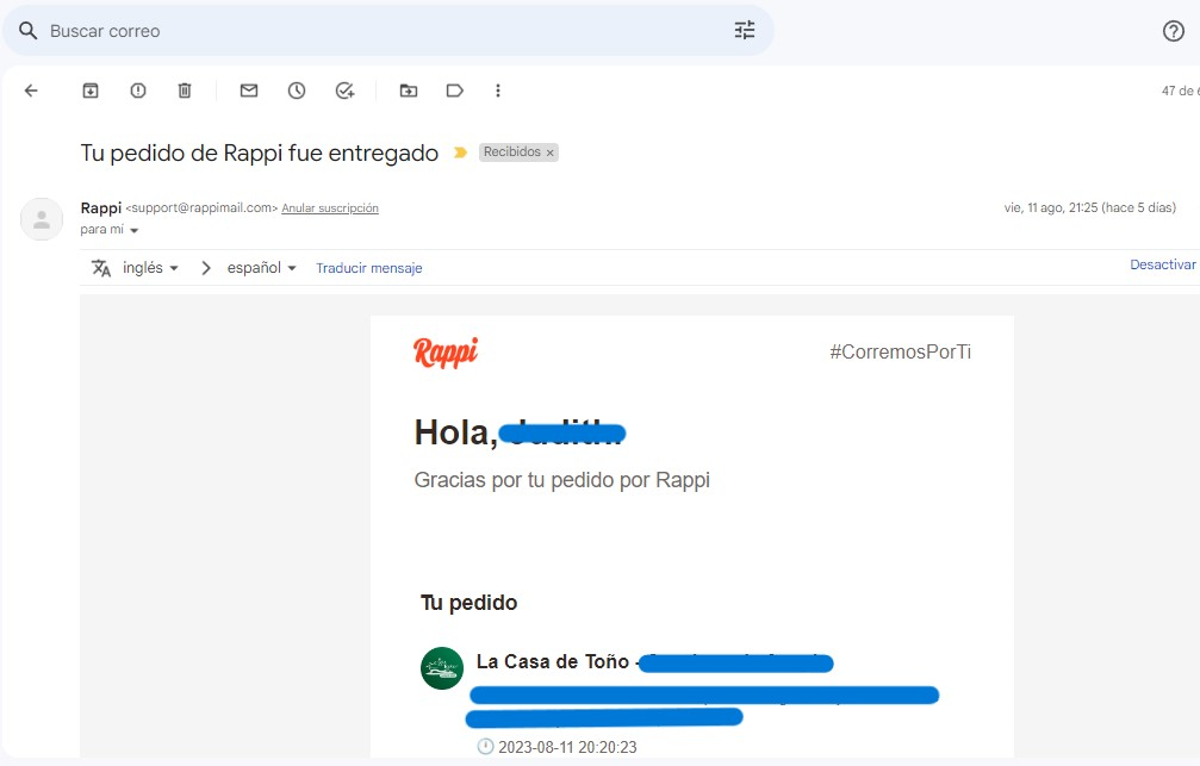 En la siguiente imagen se puede ver un correo electrónico automático informando de la llegada de un pedido.