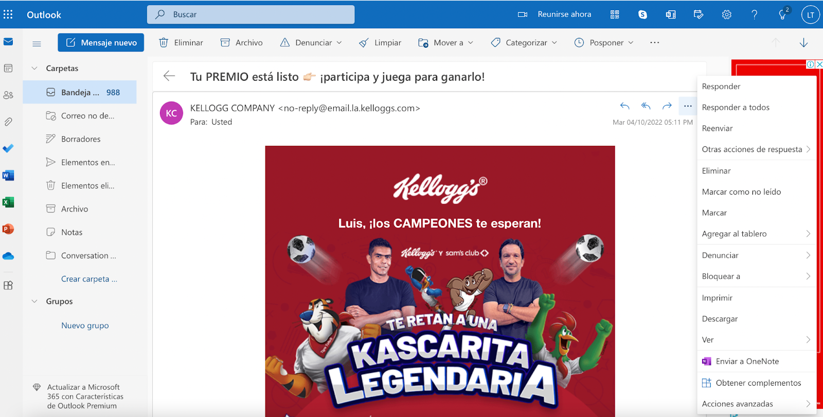 Visualizar el email header en Outlook