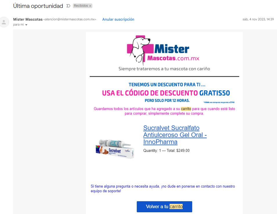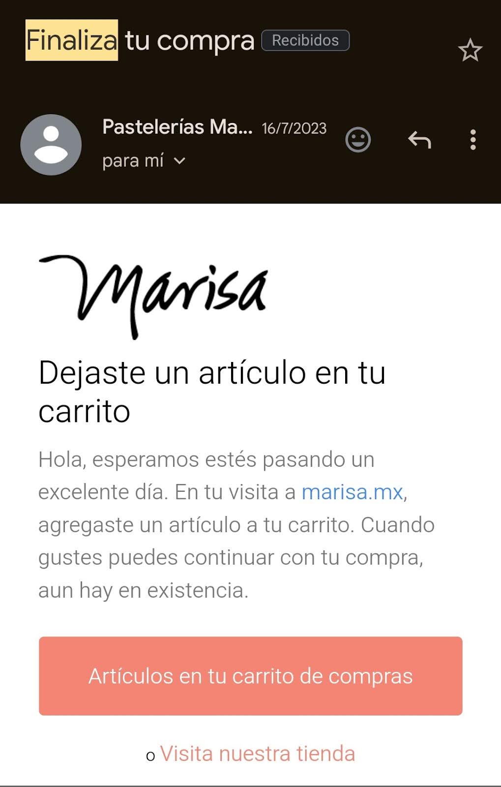 La pastelería Marisa envía correos electrónicos de carritos abandonados, donde anuncia que algunos de los productos en el carrito están aún en existencia. Esto motiva y persuade al cliente para que adquiera los productos en su carrito. Así, la pastelería logra aumentar sus ventas.