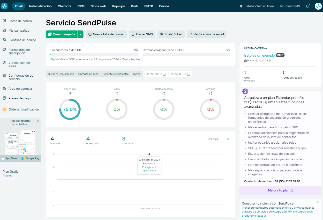- Análisis y reporte: Estar al tanto de las métricas clave como la tasa de apertura o la tasa de clics, te permitirá analizar, ajustar y mejorar las estrategias de email marketing. Plataformas como SendPulse brinda reportes detallados de estas métricas.