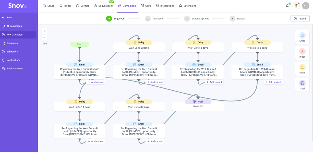 Snov.io permite diseñar secuencias personalizadas para conectarte con tus clientes potenciales, optimizar tu flujo de trabajo y aumentar las conversiones.