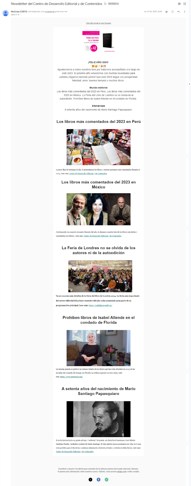 Por ejemplo, el Centro de Desarrollo Editorial y de Contenidos comparte sus Newsletters donde hablan de temas de interés para sus suscriptores. Esto les ayuda a permanecer en la mente del público.