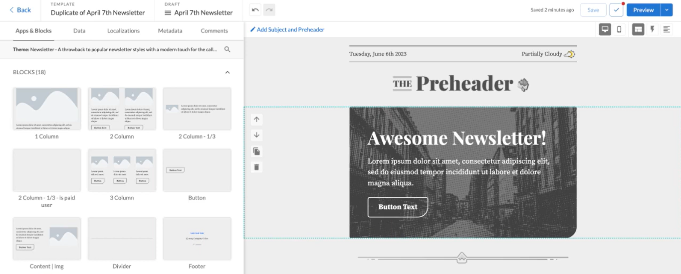 - Fácil creación: Diseñar un correo electrónico es realmente sencillo con las numerosas herramientas disponibles que muchos de los proveedores ofrecen, por ejemplo, el editor de arrastrar y soltar. Actualmente, incluso aquellas personas con poca experiencia en marketing pueden diseñar, lanzar y gestionar campañas exitosas de manera rápida y efectiva. Esto gracias a que la mayoría ofrecen plantillas prediseñadas, lo que facilita la creación de correos electrónicos efectivos.