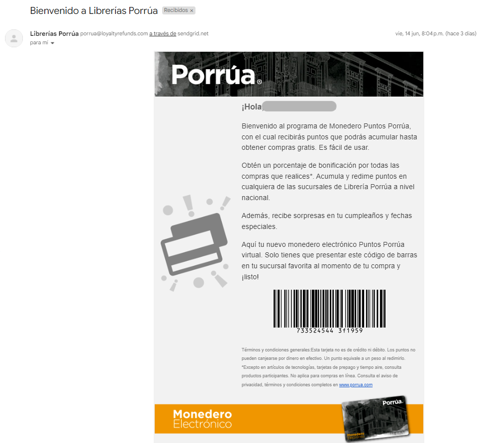 La librería Porrúa manda un correo electrónico de bienvenida a sus clientes, donde explica los beneficios de ser parte de su comunidad. Esta bienvenida es a su monedero electrónico, por lo que los usuarios pueden recibir puntos por cada compra. Esto motiva a los compradores a ser parte de la lista de contactos y a adquirir más libros.