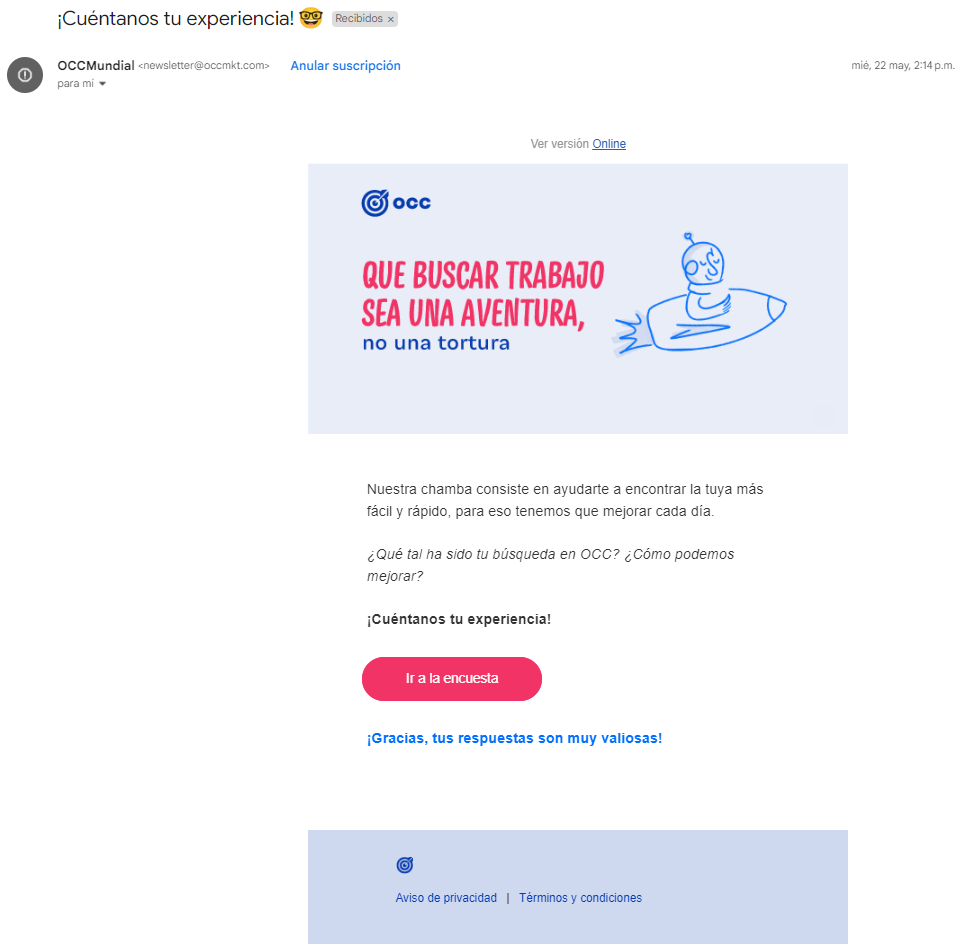 La bolsa de trabajo online OCCMundial pide a sus usuarios que compartan sus experiencias y opiniones con el sitio. Esto ayuda al sitio a identificar problemas, buscar áreas de mejora y brindar una mejor experiencia.