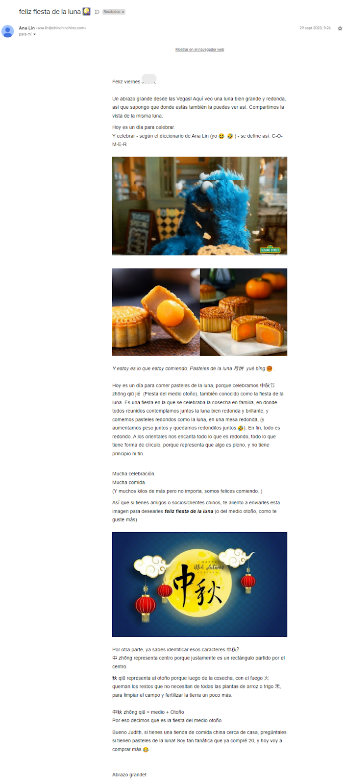 La creadora de contenido y maestra del idioma chino Ana Li comparte semanalmente un newsletter, donde manda información de interés sobre la cultura, el idioma y curiosidades sobre China. Esto ayuda a que sus usuarios se sientan motivados a abrir su mensaje e interactuar con su marca.