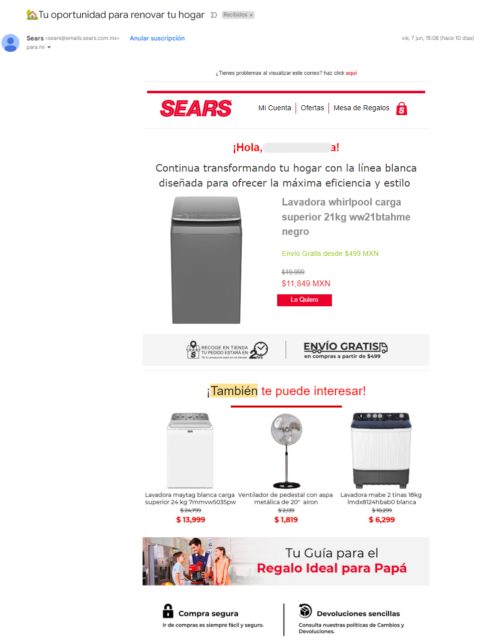 Sears manda campañas para ofrecer a los clientes productos que complementan alguna compra pasada. Esto ayuda a que los consumidores se sientan atraídos por los nuevos productos y quieran seguir adquiriendo objetos de la marca. Así, la empresa persuade a sus usuarios a adquirir productos de mayor o menor valor.