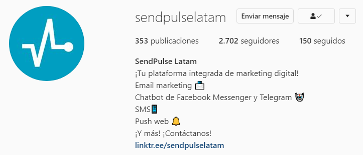 Aquí hay un excelente ejemplo de una biografía de Instagram de SendPulse Latam. La marca exprime todo el valor de esta sección de la cuenta.