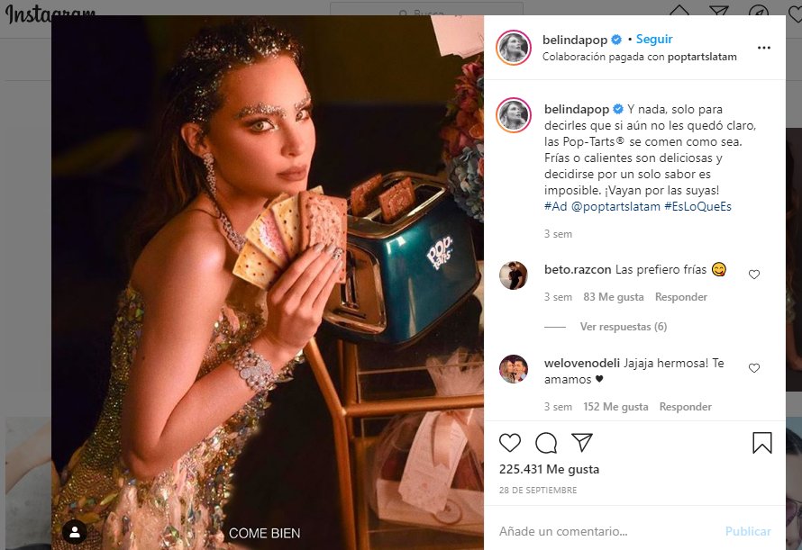 Este es un ejemplo de una campaña pagada de la empresa Pop Tarts Latam con la cantante Belinda (que tiene una de las cuentas de Instagram con más seguidores en Latinoamérica)