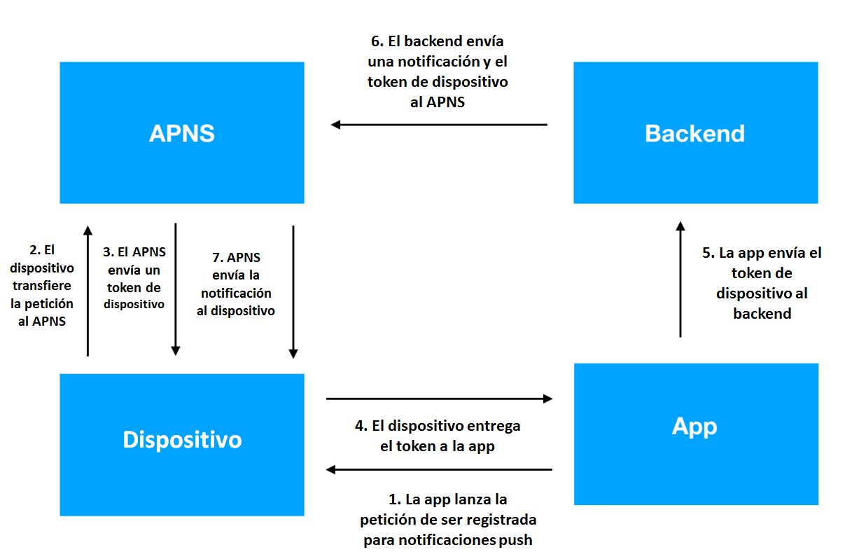 La aplicación envía una solicitud de permiso a tu dispositivo. El dispositivo entrega esa solicitud al servidor de notificaciones de Apple, que devuelve un token del dispositivo. El dispositivo reenvía el token a la aplicación, que lo mueve al backend. Después de eso, el token del dispositivo se transfiere nuevamente al servidor de notificaciones junto con la notificación misma. Finalmente, la notificación llega al dispositivo y el usuario puede verla.