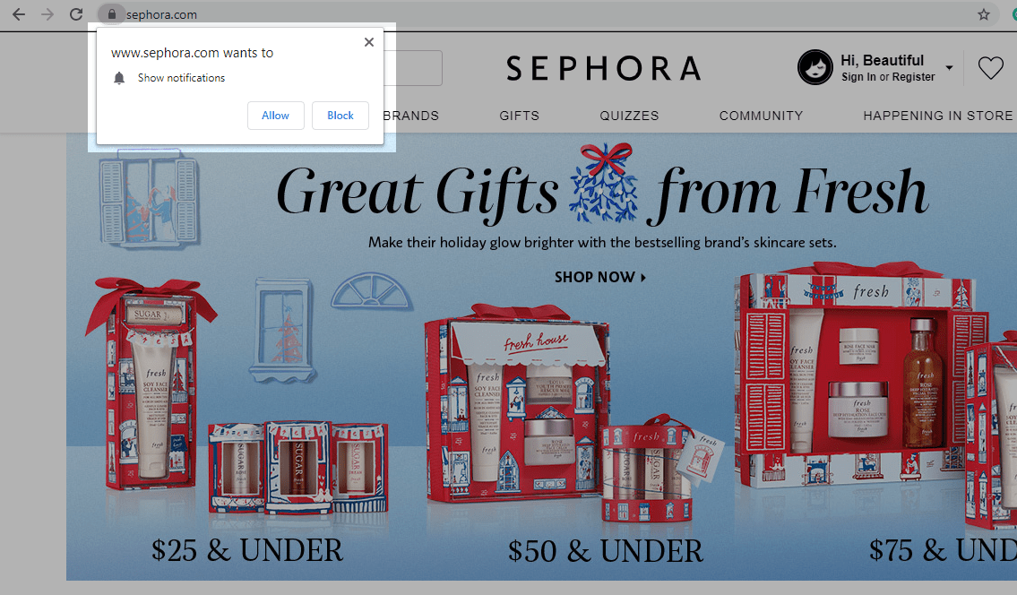 Con cualquier notificación push que desee utilizar, debe obtener el consentimiento explícito para enviarlas desde los usuarios. De lo contrario, cualquier mensaje suyo no será solicitado y su reputación comercial podría verse dañada. Cuando un usuario navega por un sitio web, aparece una solicitud de permiso como una ventana emergente en la parte superior de la página. Como en el ejemplo de Sephora a continuación, ofrece solo dos opciones: "Permitir" o "Bloquear".
