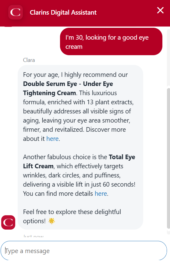 Below, you can see how helpful Clarins' assistant is in searching for the right beauty products. The user types in the inquiry and gets relevant recommendations for eye cream.
