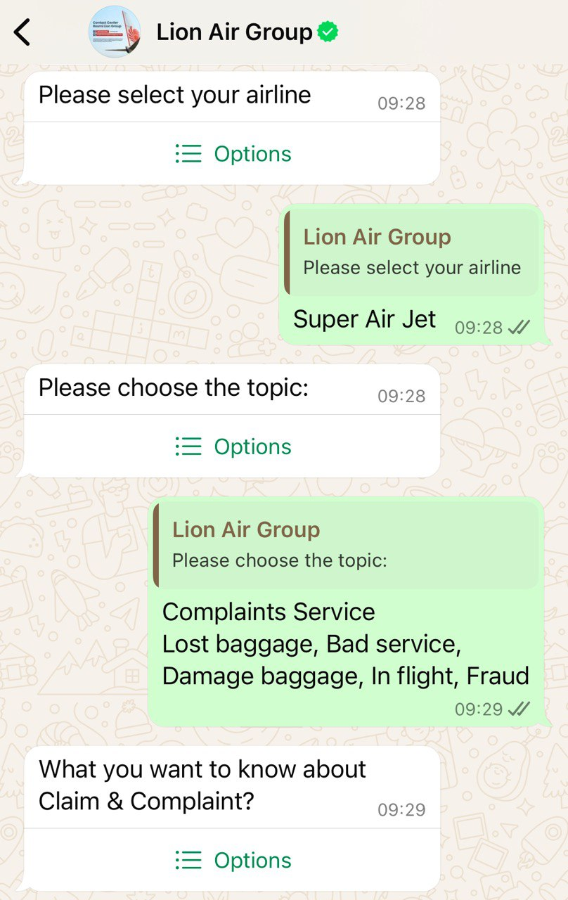 Below, you can see how to send a complaint to one of Lion Air Group’s airlines using the chatbot. Users can choose one of the options, select an airline, and send a complaint in seconds.