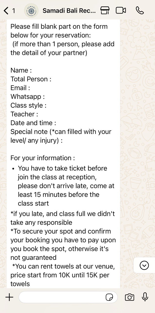 Below, you can see a reservation for a yoga class at one of the yoga studios. Users simply need to copy the message and insert their information.