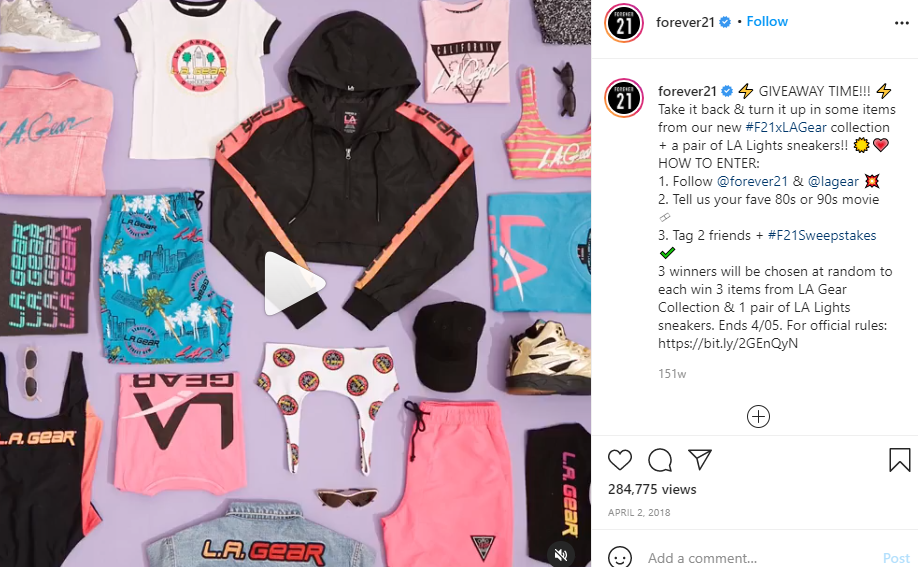 Let’s take a giveaway from Forever21, for example. The brand used Instagram for its contest. Users had to follow the rules mentioned in the post below to win the brand’s items.