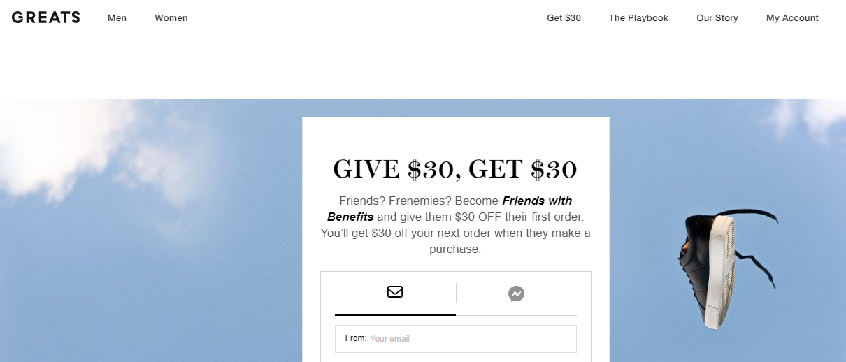 Let’s take GREATS, for example. This brand designs sneakers and offers a special discount to customers who bring their friends.