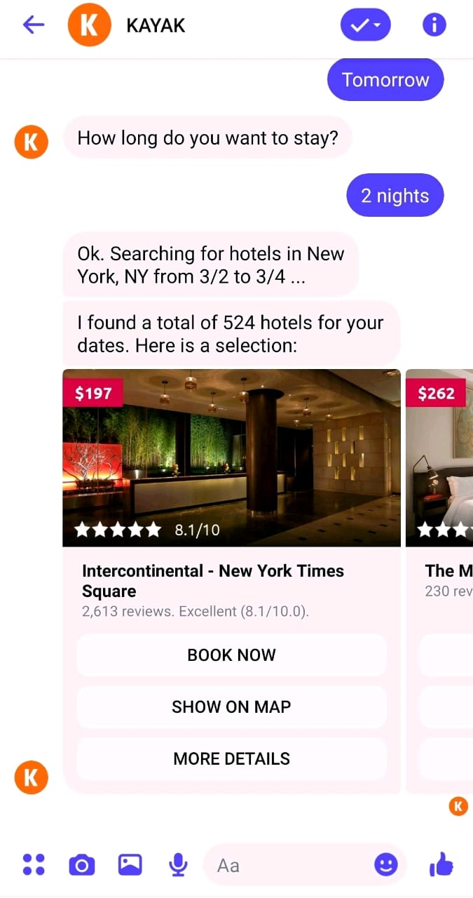 For example, with Kayak’s chatbot for Facebook Messenger, a new customer can easily find hotels, flights, and things to do. Within seconds, this chatbot searches many travel websites to find the information you need.