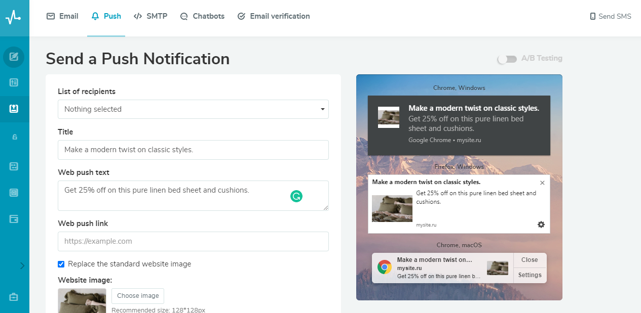 SendPulse allows you to choose a contact list, personalize and design web push notifications, send them to the necessary leads, and obtain conversions. Below, you can see how to create a web push notification by simply using our service.