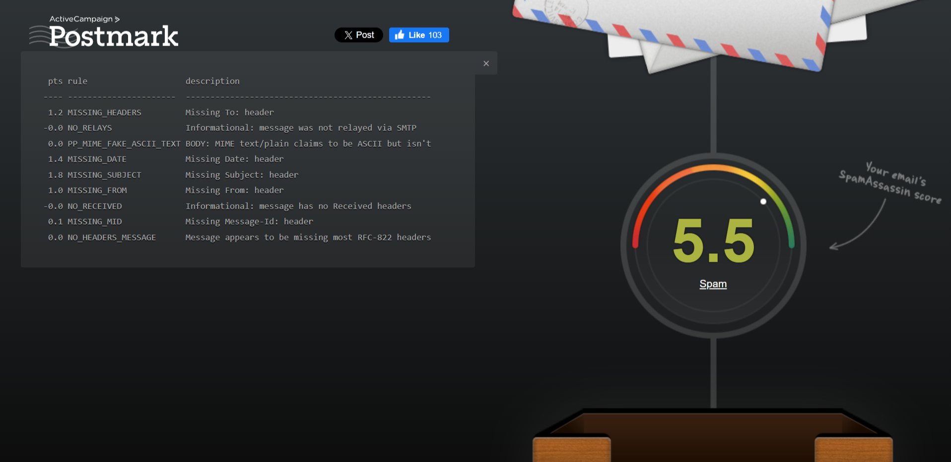 Postmark enables you to input content from your email to analyze it and identify elements prompting spam filtering. The service will evaluate your email text based on the elements that are and aren’t covered in it from one to 10.