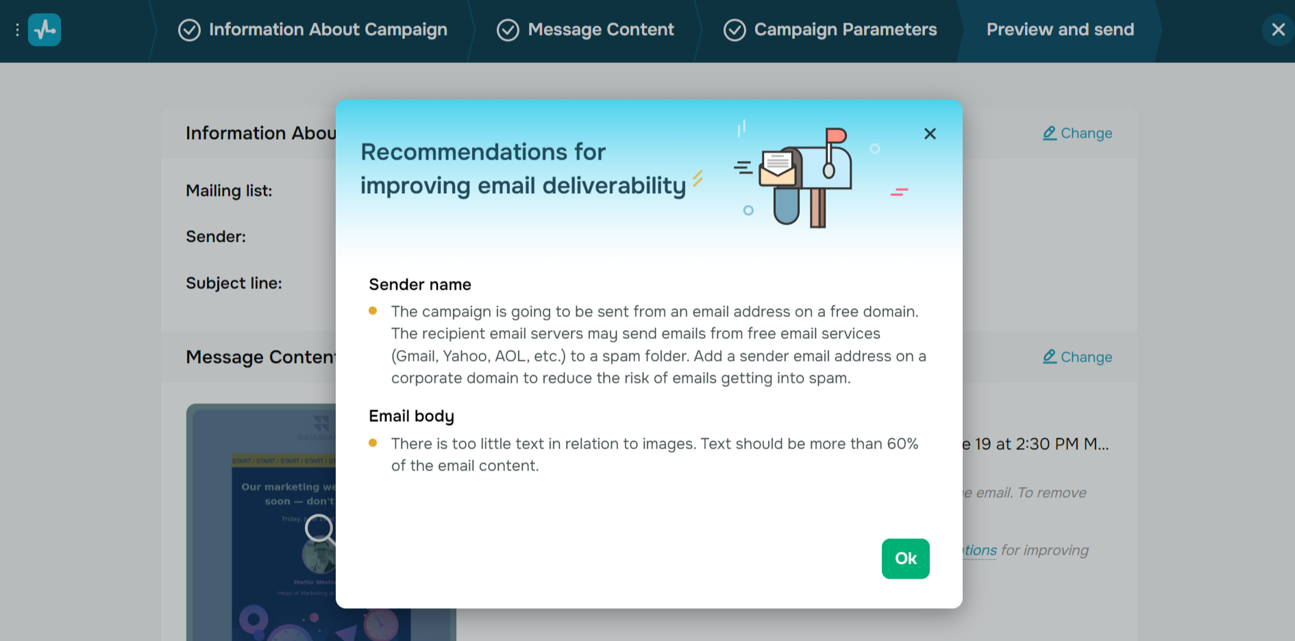 With SendPulse's built-in email spam checker, you will get recommendations on improving your campaign's deliverability in the last stage of creating a campaign. You’ll learn which authentication signatures your sender address lacks, along with tips to improve your email content and design. They include removing capital letters, exclamation marks, spammy words, adding text, an unsubscribe link, and Alt-attributes for images.