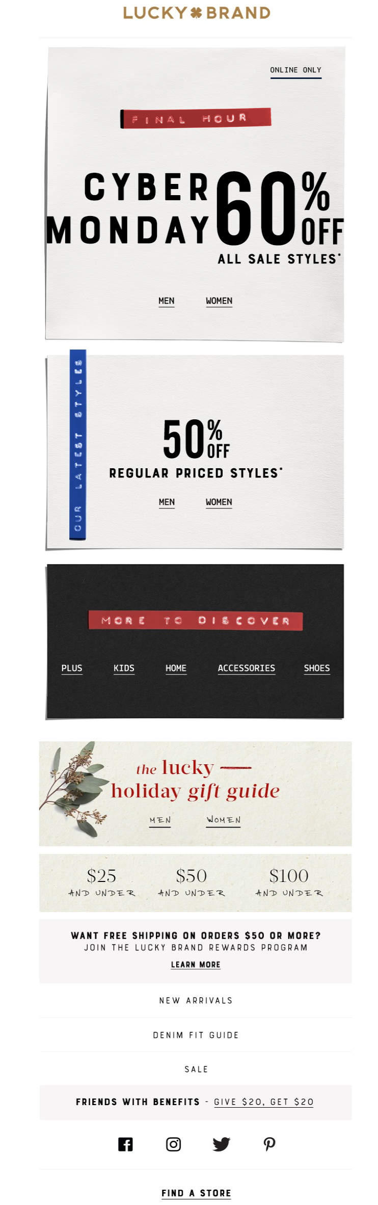 LuckyBrand offers a 60% discount for all sale styles on Cyber Monday.