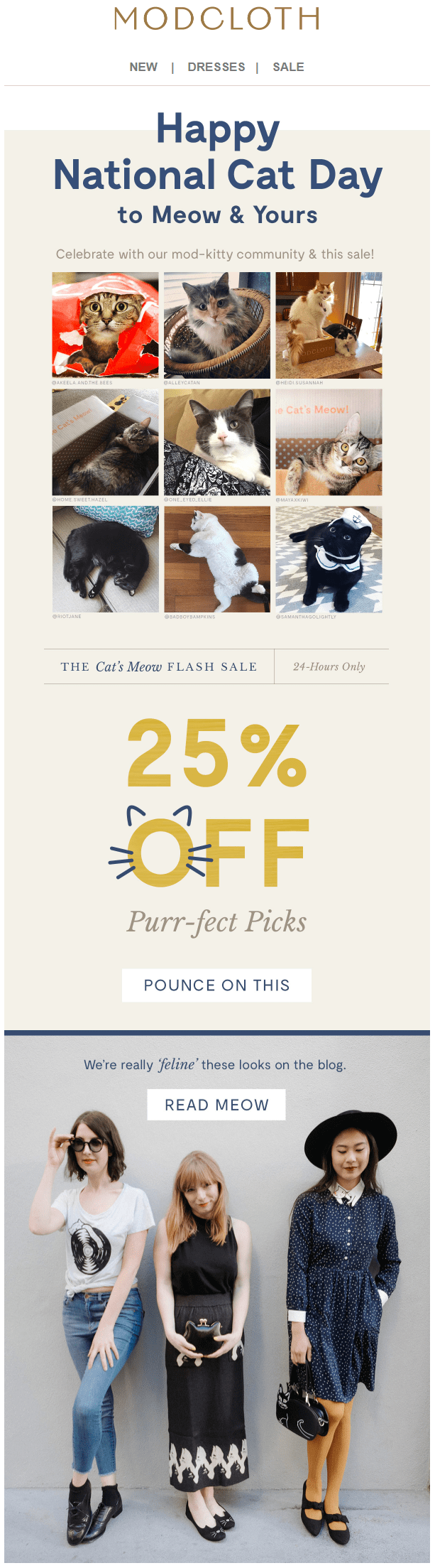 ModCloth proved themselves to be real cat lovers and didn’t miss an opportunity to celebrate the International Cat Day in one of their campaigns. The brand shared the photos of the community’s feline pets, announced a sale, and offered to proceed to their blog to check out the cat-like looks.