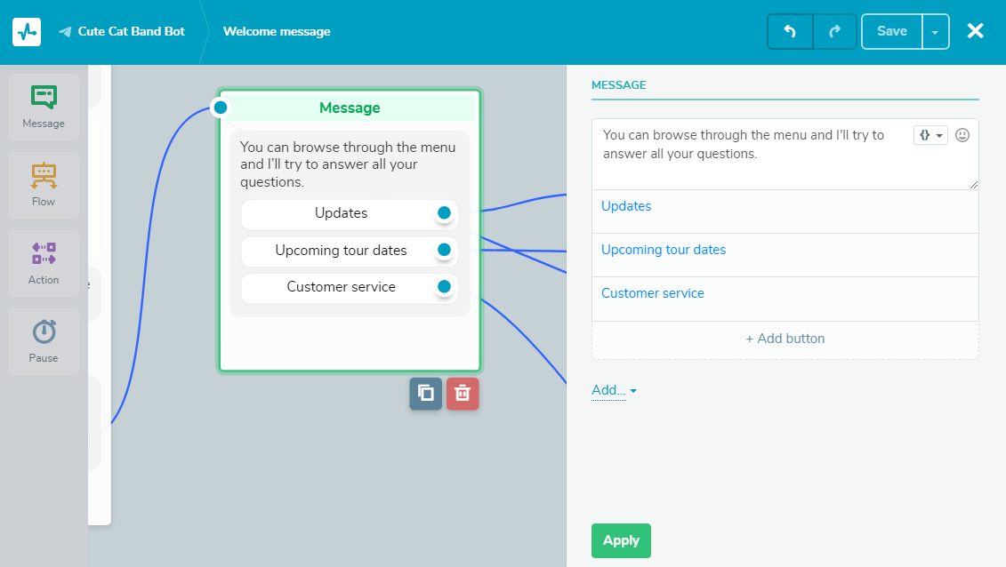 Drag the “Message” element to the workspace. We’re going to make this message look like a menu. So we’ll add three different buttons to it: “Updates,” “Upcoming tour dates,” and “Customer care.”