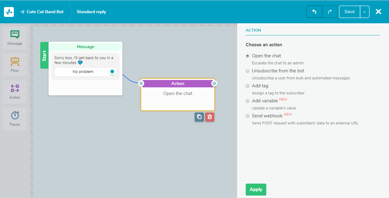 An example of a flow in response to the “Standard reply” trigger