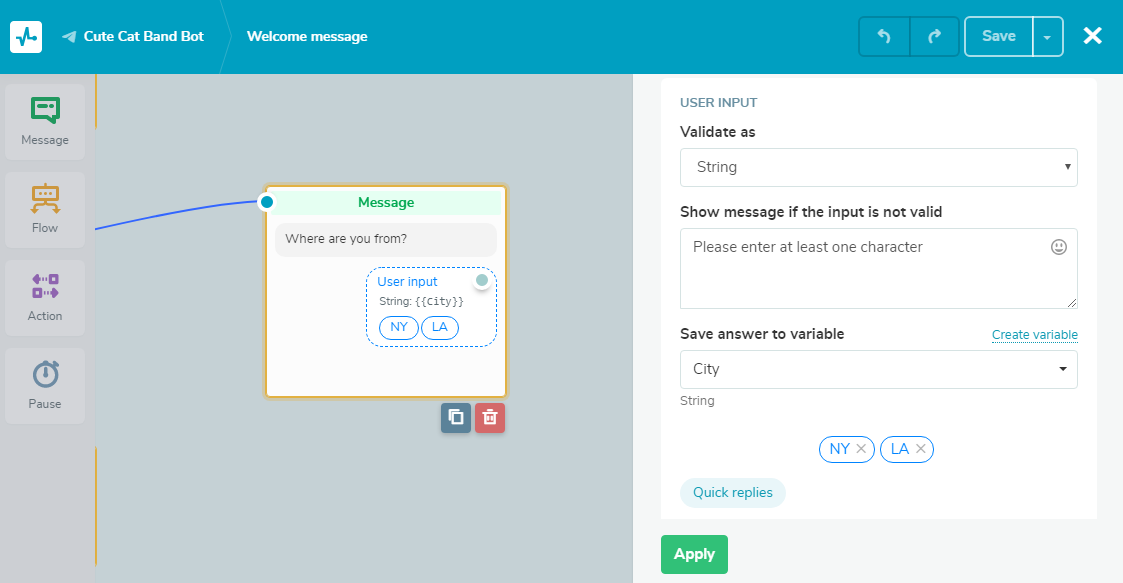 To make sure the input is accurate for string and number values, you can add quick replies, letting your subscribers choose an appealing answer from the predefined variants.
