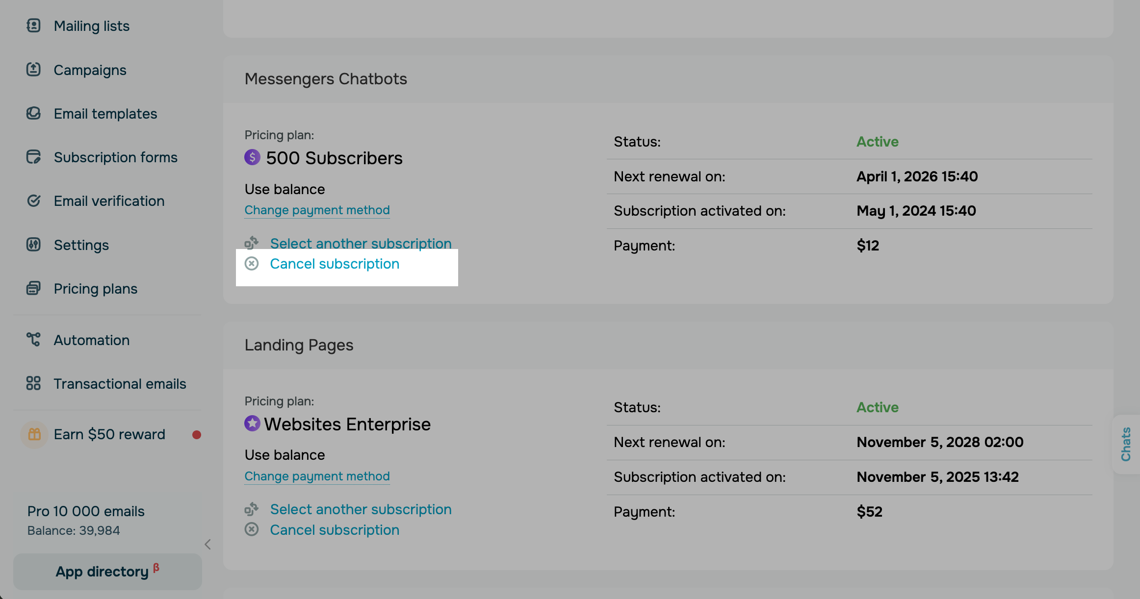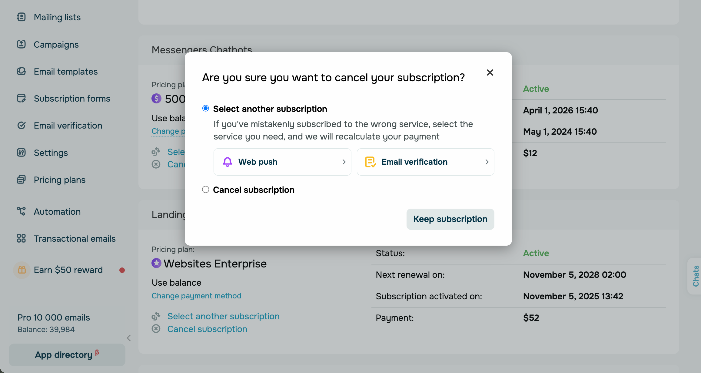 If you want to stop using a SendPulse tool altogether, you can cancel your subscription. Select a reason for canceling, and confirm your action. When the billing period ends, your card will not be charged, and the SendPulse tool you have been using will become inaccessible. However, if you pay for your canceled subscription, it will renew automatically. |