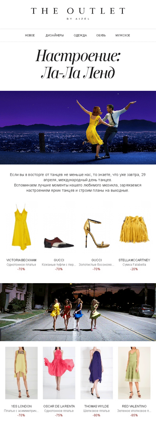 Немного танцев и драйва не повредят рассылке. Посмотрите, как подготовились к этому празднику Aizel. Они подобрали луки, которые повторяют образы героев мюзикла «Ла-ла-ленд».
