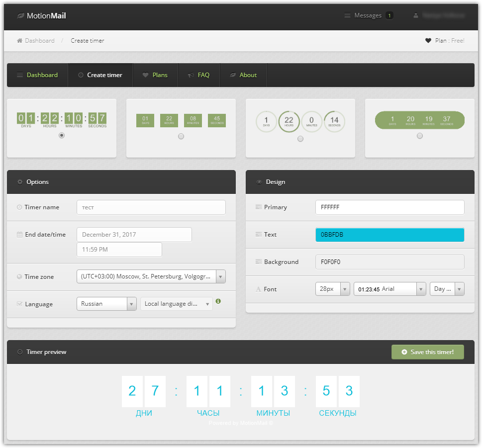 Интерфейс удобный и понятный, но доступен только на английском языке. Есть 4 разных дизайна. Для таймера можно задать фон, изменить цвет и размер шрифта. Код можно редактировать. Доступен предварительный просмотр таймера, который вы создали.