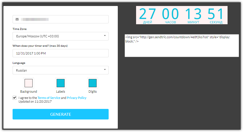 Вариантов дизайна нет, но есть возможность выбрать цвет фона, текста и самого таймера. Нажимаем кнопку «Generate» и получаем код.