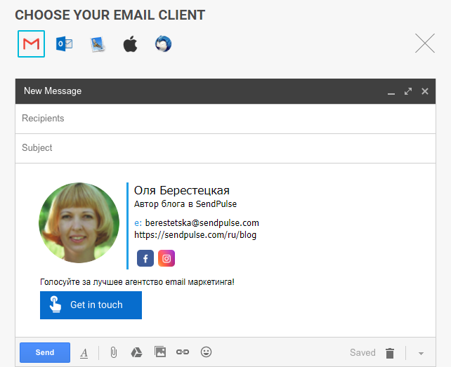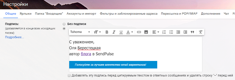 - Подпись добавлена в почтовый сервис, через который вы общаетесь с клиентами, — Gmail, Outlook. Или же в ваш сервис рассылки, например, SendPulse.