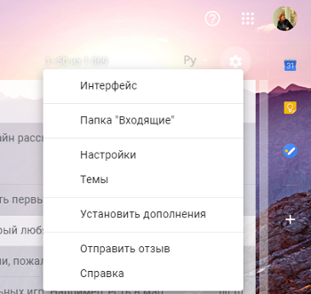 Чтобы добавить подпись в Gmail, войдите в свой аккаунт, нажмите иконку шестеренки в правом верхнем углу и перейдите в меню «Настройки»: